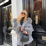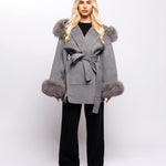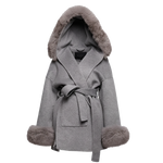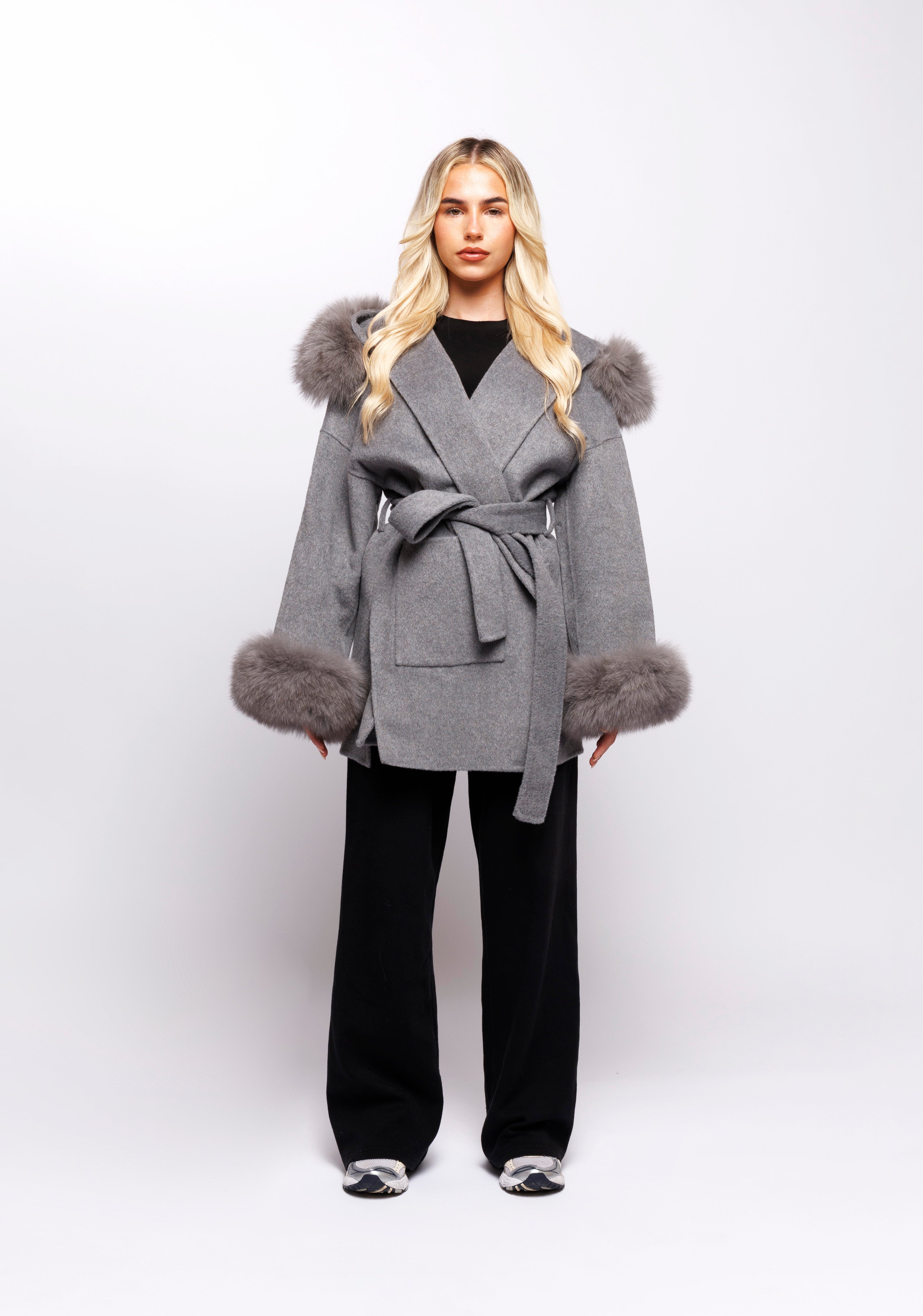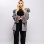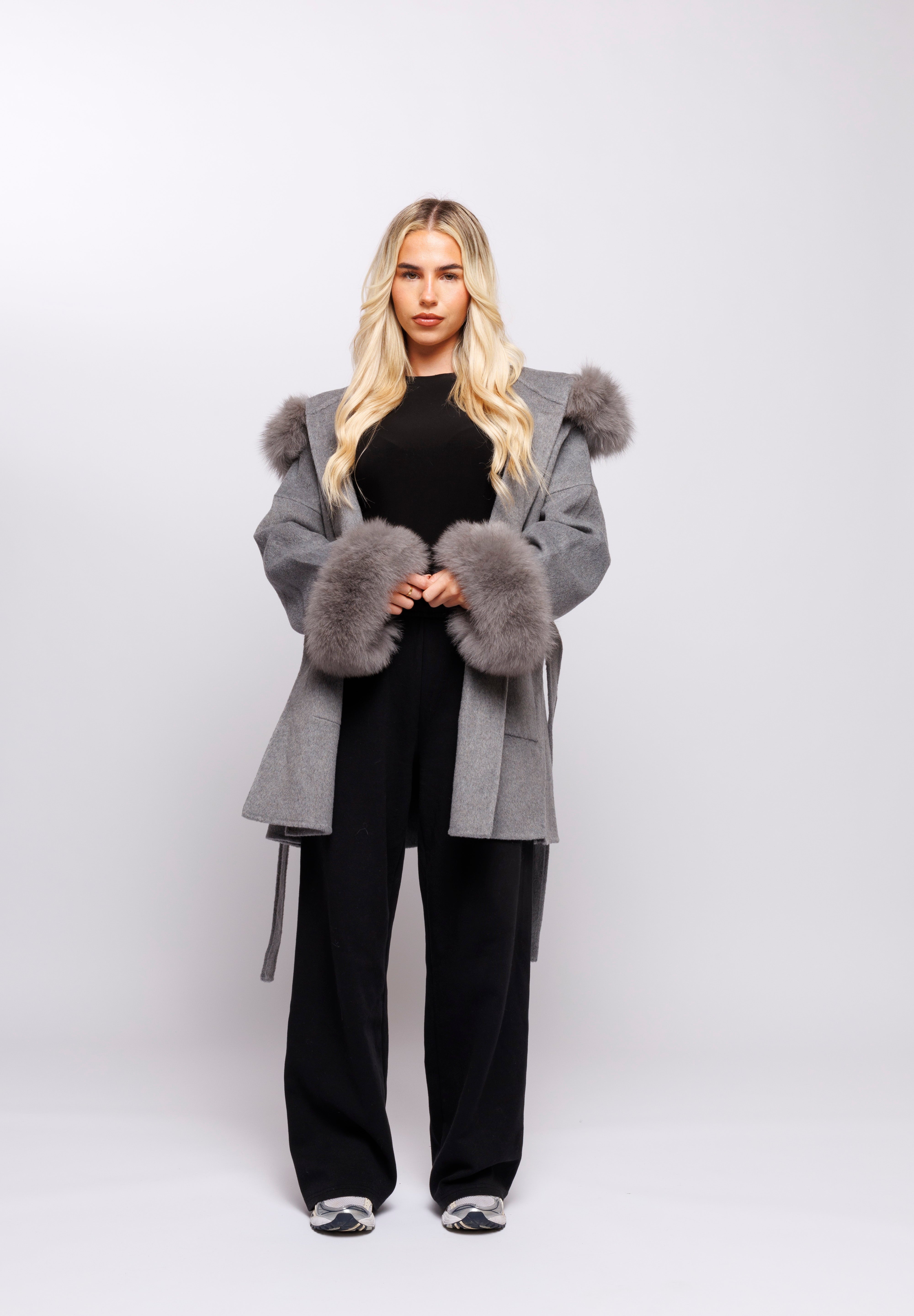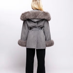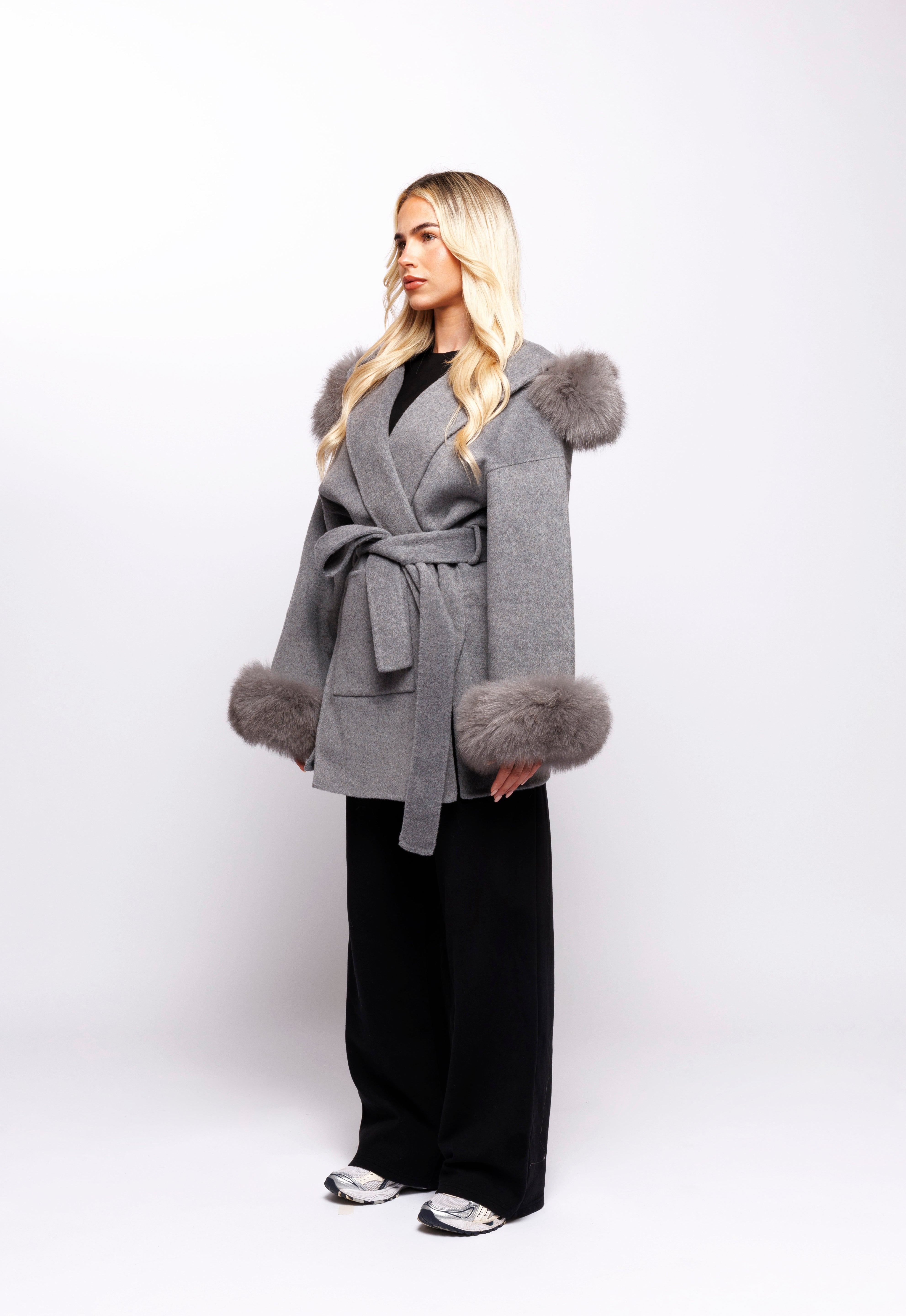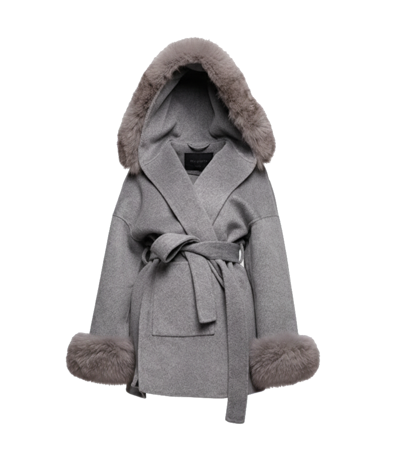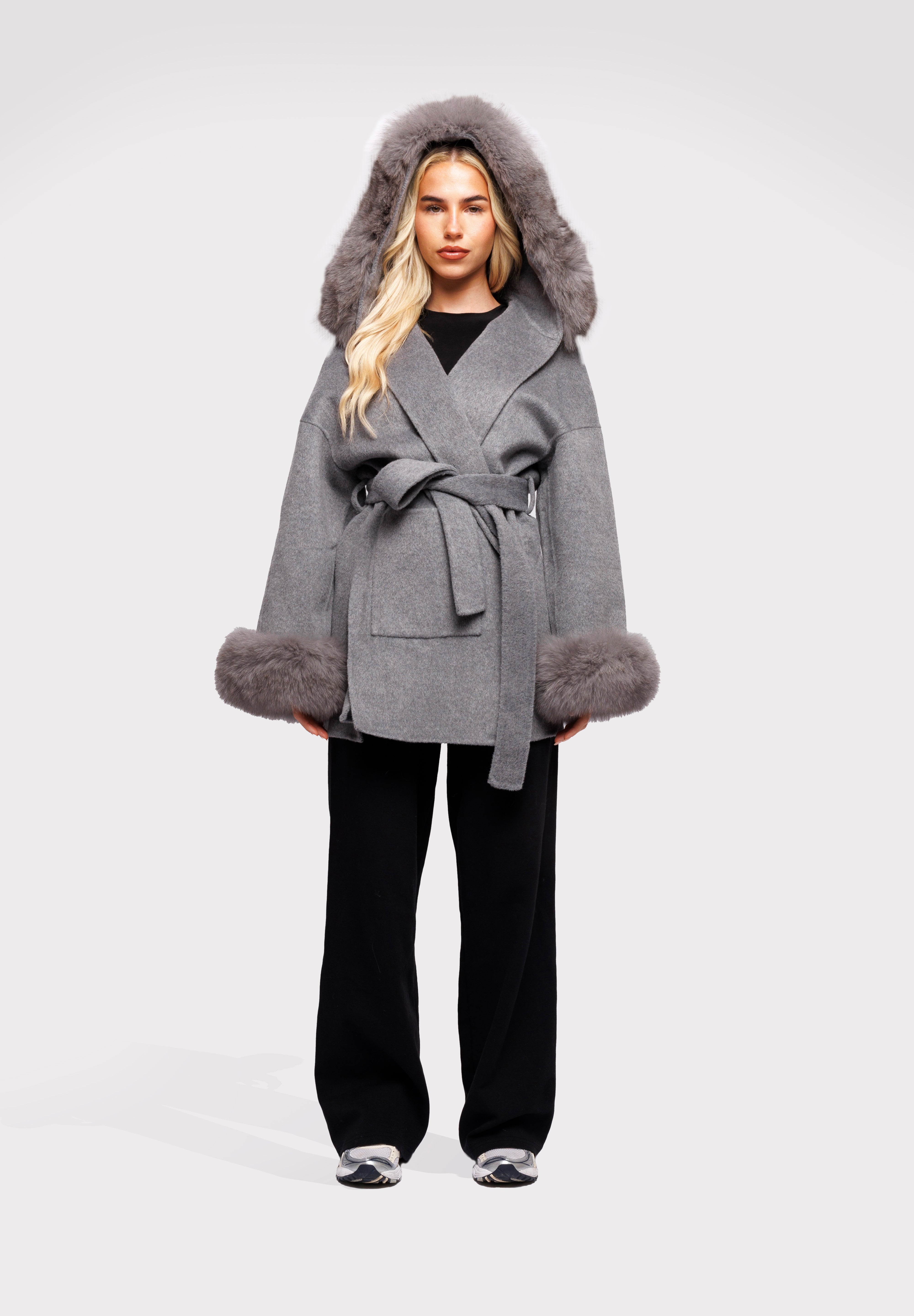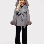 The coat stands out with its oversized fit and wide lapel collar, complemented by a generous hood and wide cuffs, both richly trimmed with fur (or faux fur) in the same dark gray shade, providing an extra touch of warmth and glamour.
