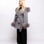 Details: Self-tie belt, Fur-trimmed hood, Fur-trimmed cuffs.